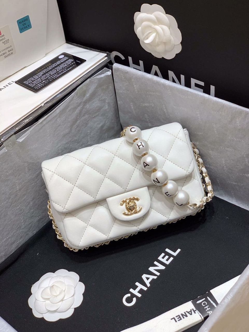 Chanel Flap Pearl Embellished Bag 18cm Gold Hardware Lambskin Leather Spring/Summer Collection, White